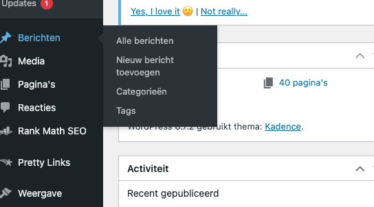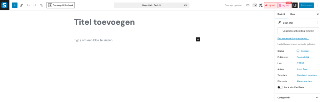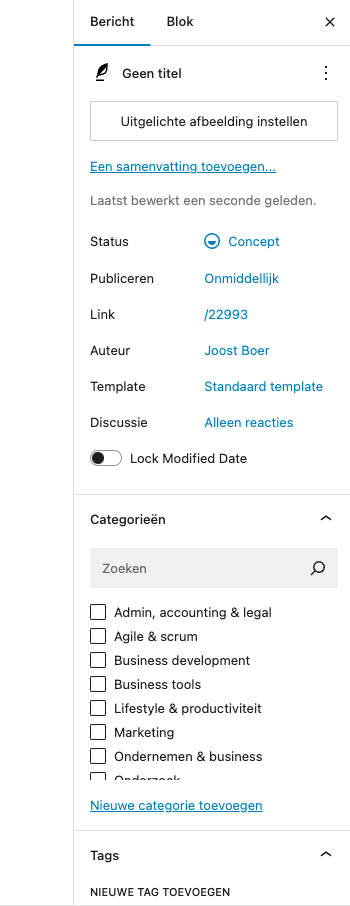 In het menu aan de rechterkant kun je categorieën, tags en een uitgelichte afbeelding toevoegen aan je blogpost.