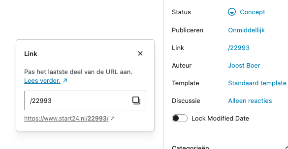 Tot slot kun je door op de tekst naast Link te drukken het laatste deel van de URL aanpassen. Ik raad je aan dit deel kort te houden: hooguit tussen de 3 en 5 woorden. Dit is gebruiksvriendelijker voor je bezoekers.
