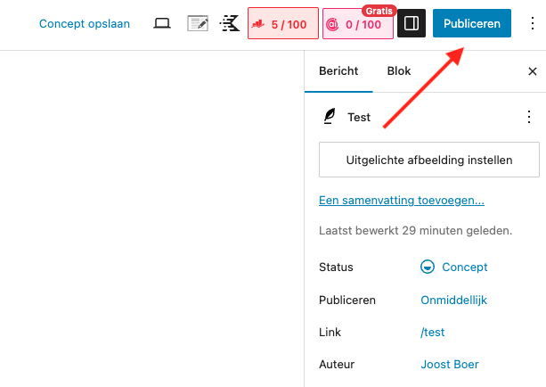 Zodra je tevreden bent met alles, druk je op de Publiceren knop rechtsboven in de editor.