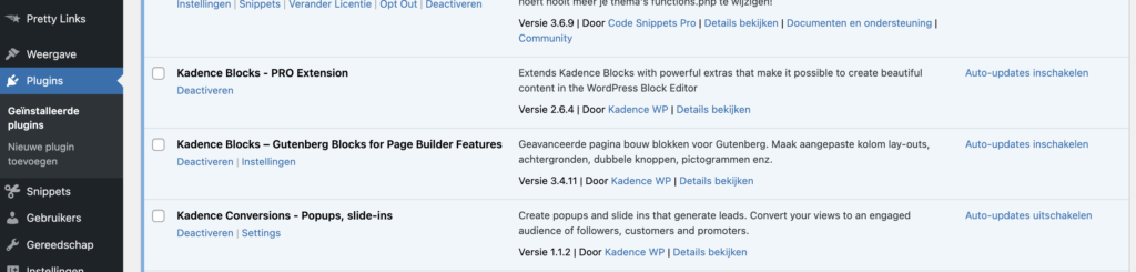 Je plugins kun je updaten via het WordPress dashboard. Wanneer er een nieuwe versie voor een plugin is, wordt dit aangegeven. Je kunt hier ook instellen of updates automatisch uitgevoerd moeten worden (via de blauwe link “Auto-updates inschakelen”). Voor mijn meeste websites gebruik ik deze optie, omdat ik vertrouw op de developers van alle plugins die ik gebruik en ik de kans zeer klein acht dat er iets stuk gaat op mijn sites door een update.