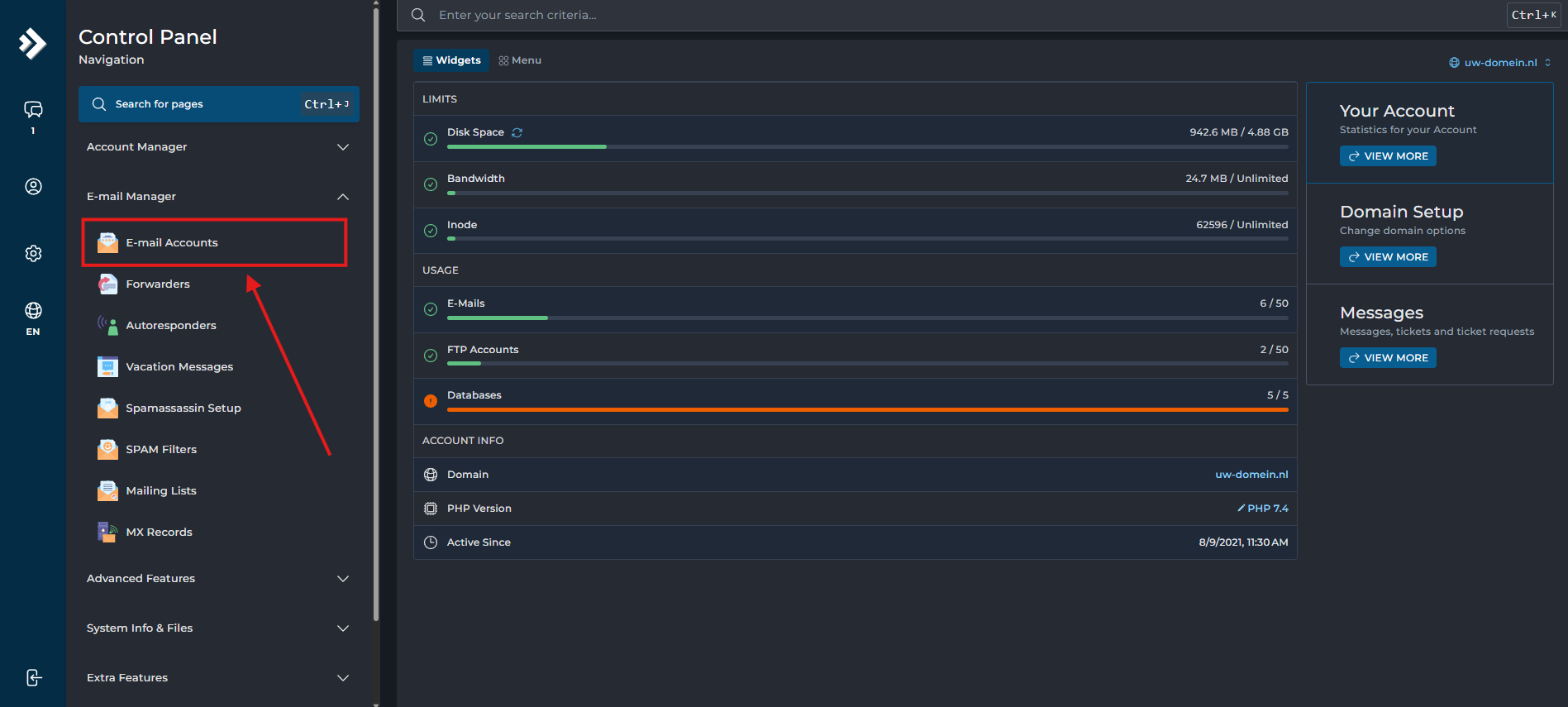 Klik in het menu aan de linkerkant op E-mail Manager en daarna op E-mail Accounts.