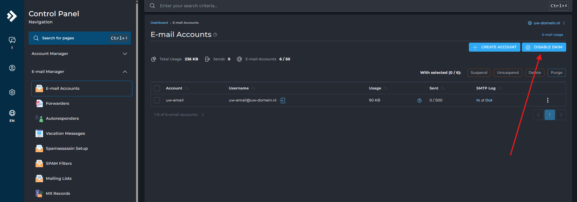 Je kunt deze dan eerst uitzetten door op DISABLE DKIM te klikken en daarna weer aanzetten met ENABLE DKIM. Dit herstelt de DKIM-instellingen (bijvoorbeeld handig bij DNS-problemen).