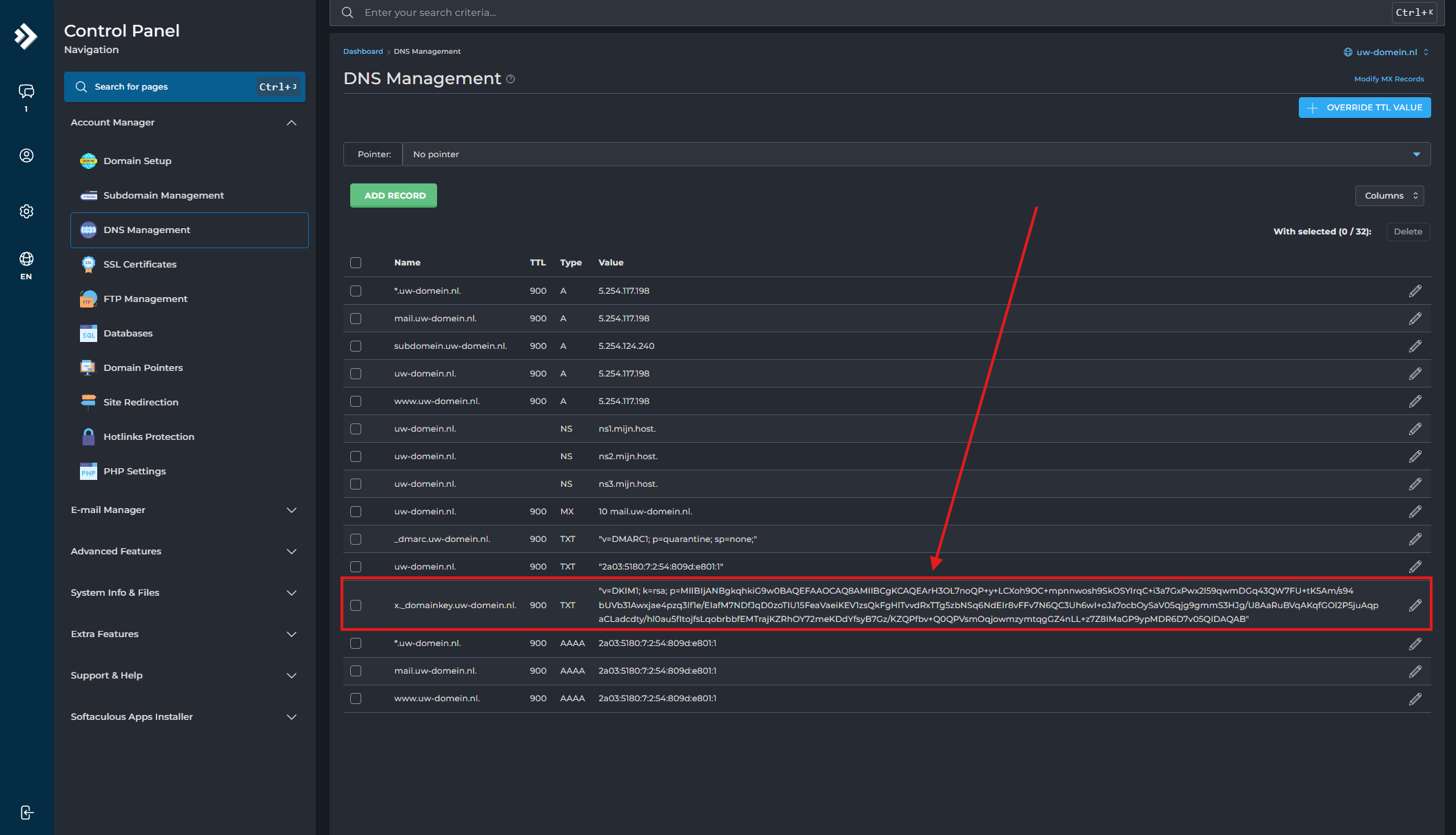 - Zoek het record dat begint met:x._domainkey.uw-domein.nl.